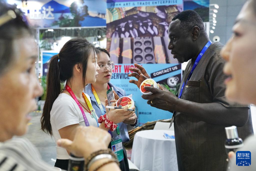 不远处的布隆迪展区,当地原料制造的辣木籽油、辣木籽身体香膏也吸引着不少专业观众前来问询、试用。短短半天,已有20多个采购商留下对接方式。