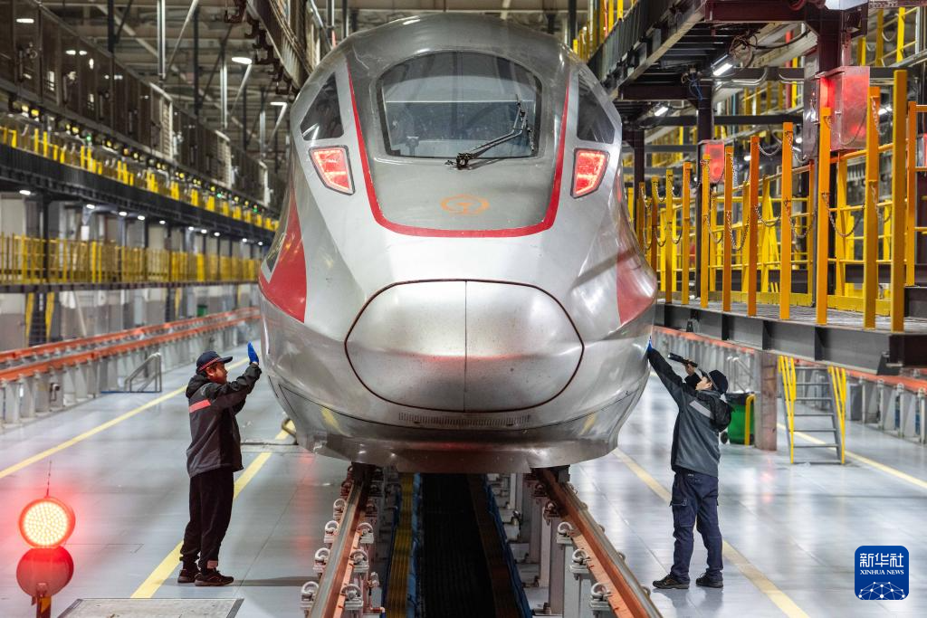 2月2日凌晨,机械师在长沙动车运用所检查动车组车体两侧情况。新华社记者 陈思汗 摄pagebreak
