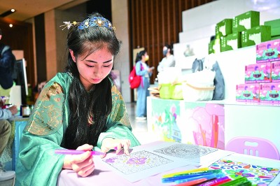 中国国家博物馆内,观众在纸上进行文物纹样涂鸦。新华社发
