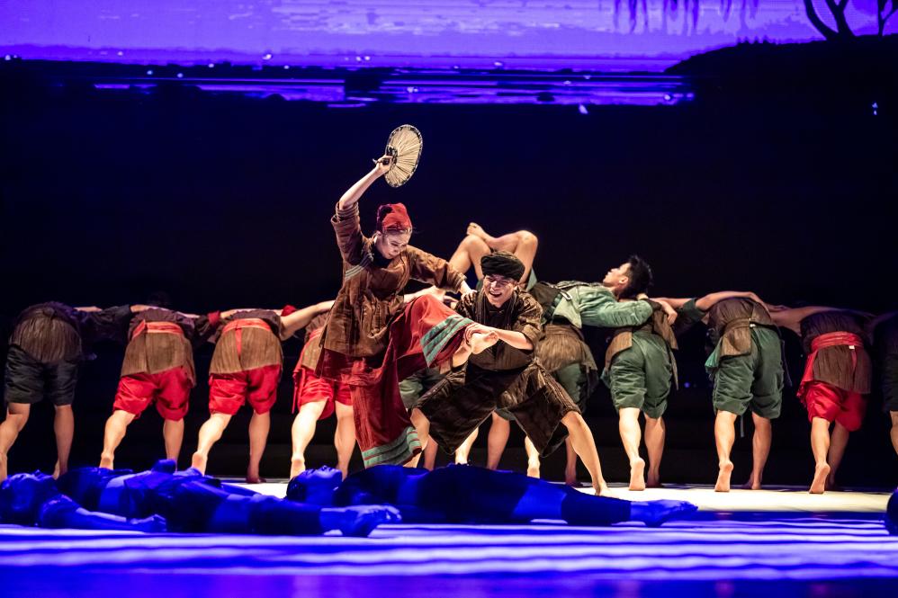 整场演出以“大地”“扎根”“雨润”“花开”四篇章展开,以舞蹈艺术为载体,呈现从美育筑基到成果绽放的完整育人历程。双人舞《瓷爱》灵感取自全国首部陶瓷烟花剧《国彩醴陵》,以肢体语言演绎瓷泥与窑火的交融,致敬工匠精神与湖湘文化。《父亲的扁担》曾获全国大学生艺术展演舞蹈类二等奖,通过质朴的劳动动作塑造父爱形象,传递勤劳美德与亲情温暖。压轴作品《年年有鱼》作为入围中国舞蹈“荷花奖”评选终评作品,取材侗族“喊天节”民俗,将生活场景转化为灵动诙谐的舞蹈叙事,彰显了美育扎根传统、守正创新的活力。
