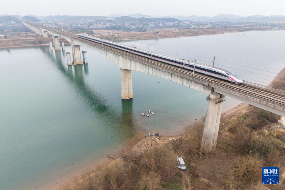 1月29日,一列高铁经过沪昆高铁湘江特大桥(无人机照片)。新华社记者 陈思汗 摄