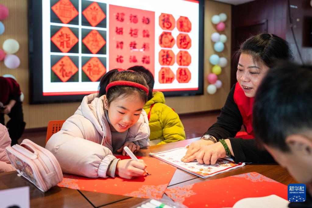 2月1日,在芙蓉区识字里社区服务中心,学生们在课堂上写福字。新华社记者 陈思汗 摄pagebreak