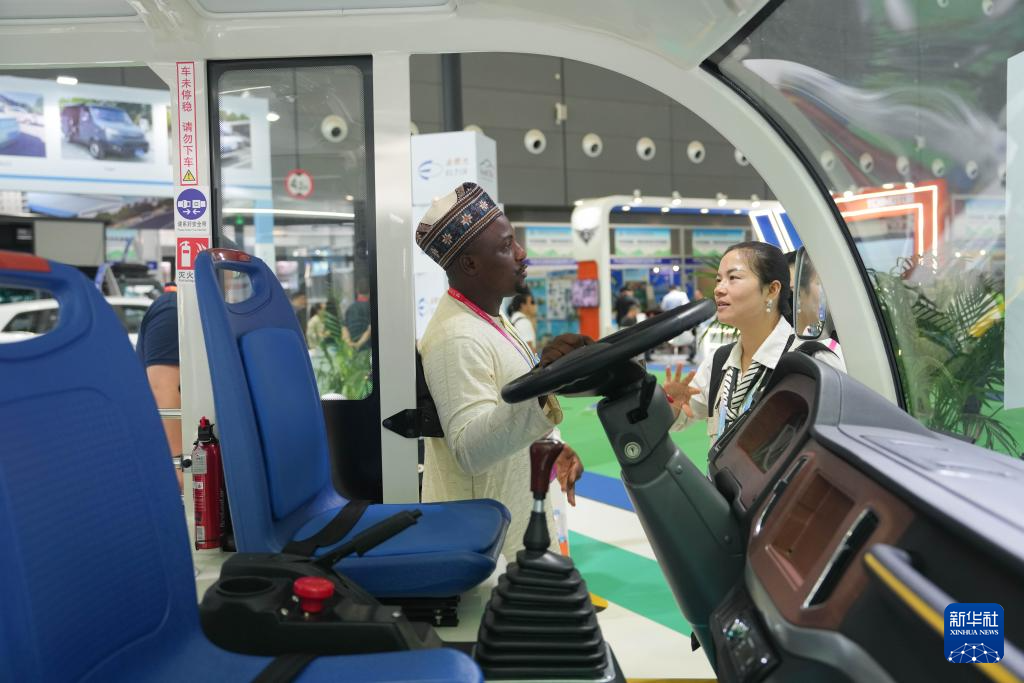 6月12日,在长沙国际会展中心,参展商(右)向观众介绍旅游观光车。新华社记者 薛宇舸 摄pagebreak