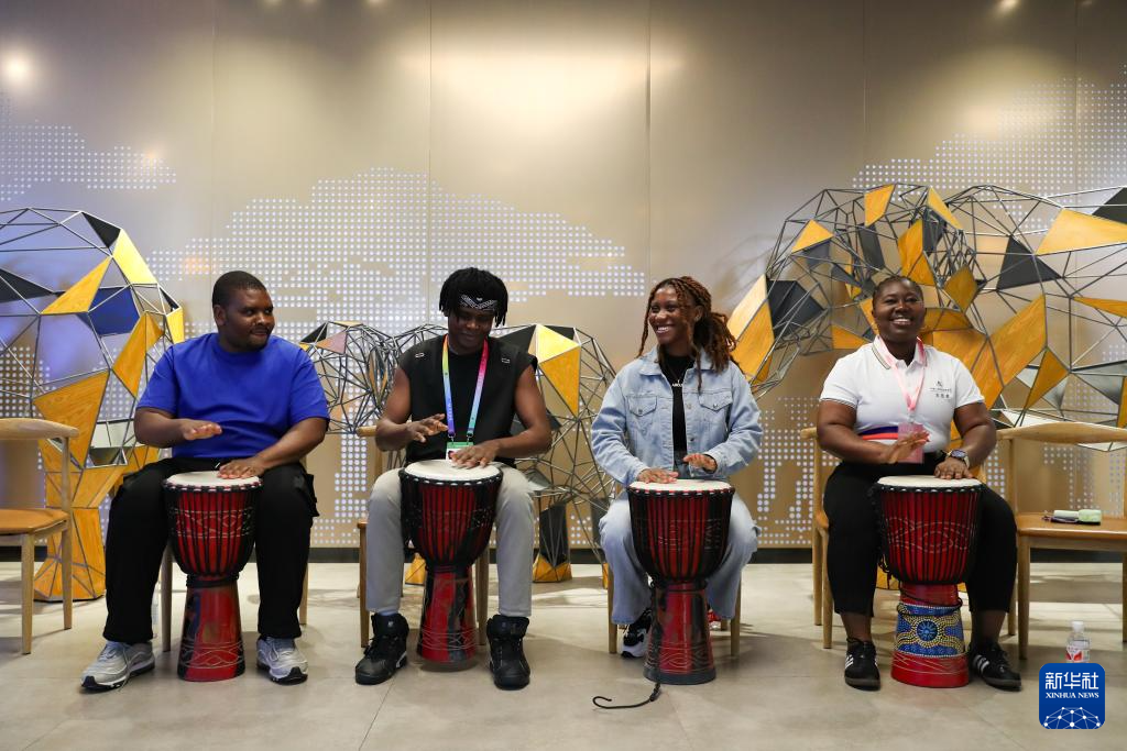 6月12日,在长沙的中非经贸博览会常设展馆,非洲籍志愿者打手鼓欢迎来访的客人。新华社记者 王婧嫱 摄pagebreak